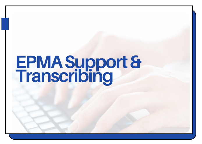Clinical transcribing of paper medication charts. On-ward EPMA guidance and data input. Clinical validation and cross-checking Our pharmacist-led EPMA support ensures medication safety remains a priority.